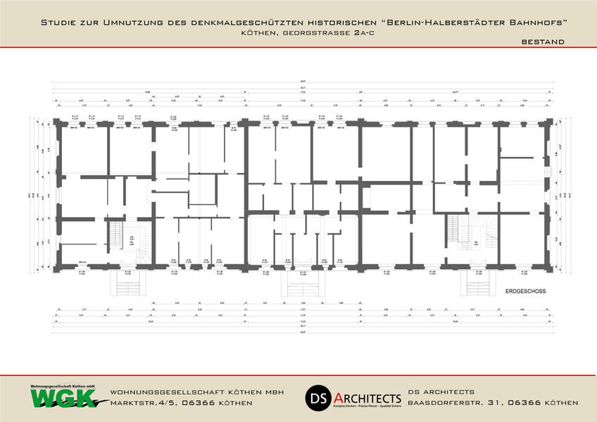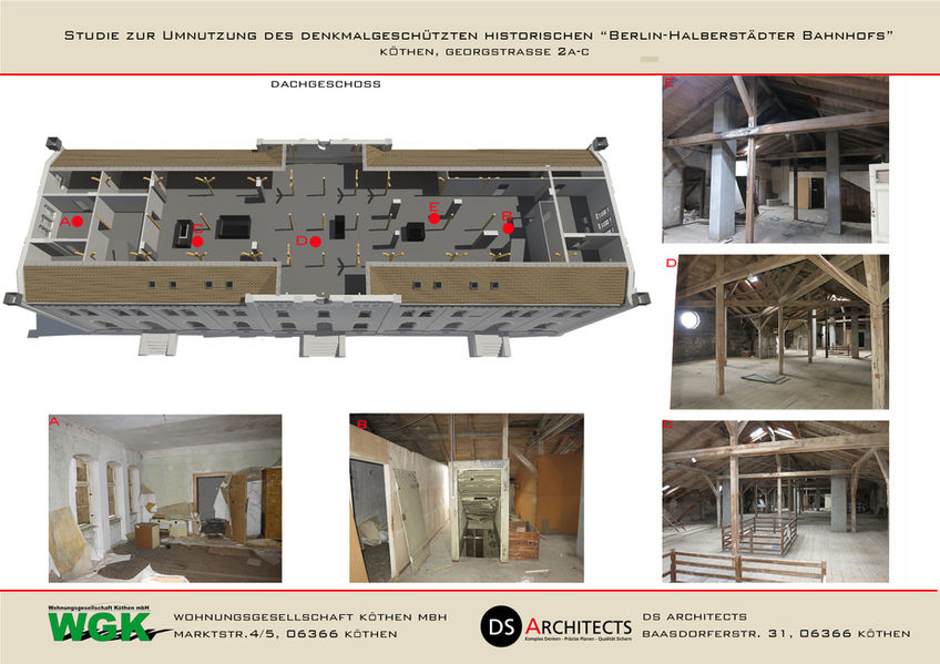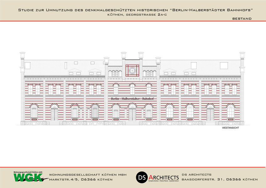 Der alte Bahnhof der Strecke Berlin-Halberstadt in der Georgstraße sollte einer Voruntersuchung zur Revitalisierung als Archiv, Büro und Wohnen unterzogen werden. Einerseits ist dem dringenden Bedarf an Archivierungsfläche Rechnung zu tragen, andererseits ist es Ziel ein wichtiges Baudenkmal der Stadt Köthen zu erhalten. Ein großer Vorteil für die angedachten Nutzungen ist die innerstädtische Lage sowie kurze Wege zur anbietungspflichtigen Verwaltung und den damit verbundenen Kommunikations- und Transportwegen. Die Grundfläche im Erdgeschoss bietet neben dem öffentlichen Bereich ausreichend Platz für die notwendigen Magazine und die nötigen Zuwachsflächen für mindestens 10 Jahre.